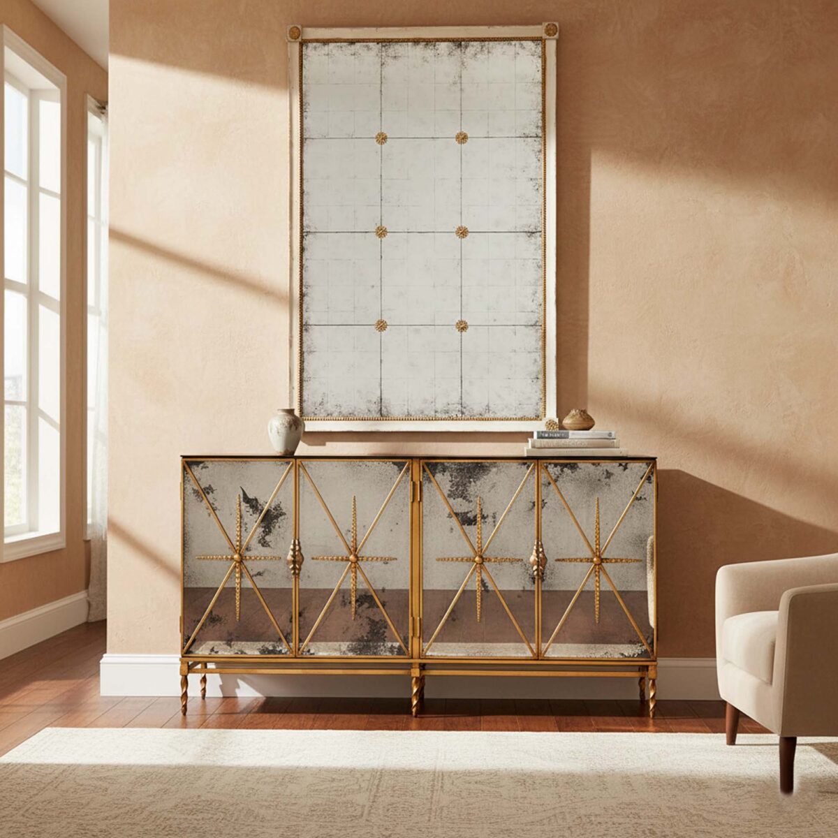 Lanier հայելին ունի հնաոճ, մոխրագույն և ոսկեգույն ուլունքներից շրջանակ։ Հայելու վրա առկա են տասներկու հայելային փայլուն սալիկներ։