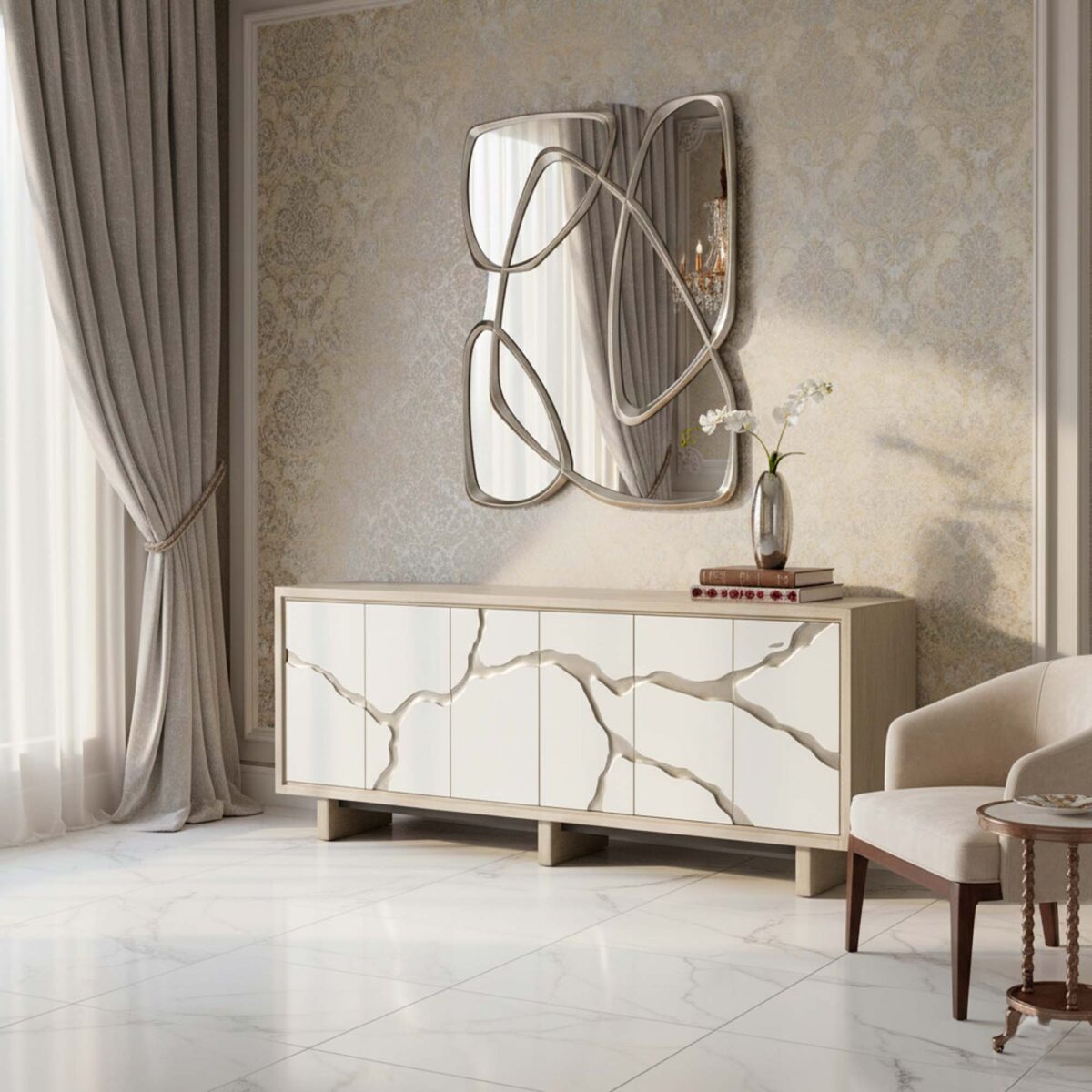 Серебристый буфет Ravine это уникальное произведение искусства, демонстрирующее современный дизайн и манящую палитру. Шесть дверей украшены панелями из зеркального стекла с серебристым блеском, создают элегантный вид. Имеет распашные дверцы и европейские петли, а также три тонкие ножки, подходящие к раме.