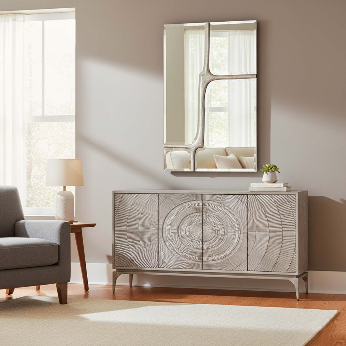 Зеркало с абстрактным металлическим узором разделено на четыре части. Имеет очень тонкую серебристую металлическую рамку.